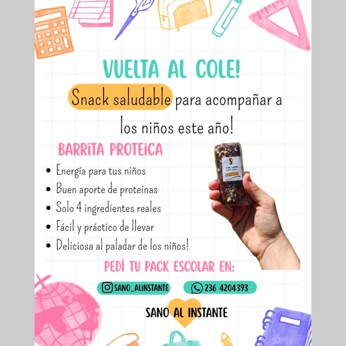 Promo: $8.000 x 5 barritas proteicas. Descripción: barritas con ingredientes reales y nutritivos. Aporte de energía y proteinas para los niños. Ricas y practicas de llevar al cole. La promo corre por todo Marzo